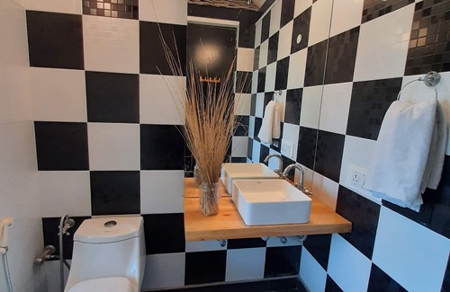 This 165 sq ft room overlooks the fields. Its door opens to a shared balcony with the Jugnu room where you can stretch your legs on reclining chairs. It comes equipped with a queen size bed, a writing desk, a TV and a modern white & black chequered en suite bathroom. It can accommodate one extra mattress (additional cost) as well