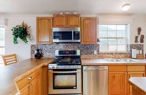 At the home, you’ll love the secluded, quiet location. Inside, you’ll find an open floor plan that combines the living room, dining area, and kitchen. Stylish, comfortable furnishings, and lots of natural light make the space live large. The chef will love the full suite of stainless steel appliances and plentiful counter space, and the gang can dine together at the table for six before heading out to explore.