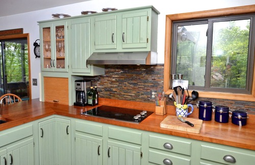 The main living room is styled with beautiful rustic maple floors, 20 foot ceilings with exposed beams and large bay windows that get amazing natural light. It is the perfect space for large family gatherings or to sit around the slate hearth with a roaring fire on cold winter nights. In the summer, open the home's seven sliding glass doors to cool mountain breezes coming up from the valley.