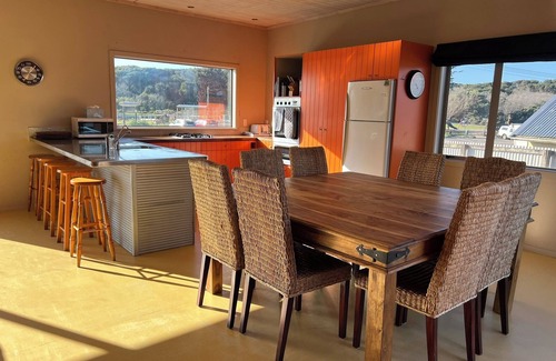 Fabulous location for a beach getaway ; Fully fenced located right across from the beach entrance, a stone throw away from the store/takeaways and next to the Cosie Club. The spacious open plan living/kitchen/dining opening to the front deck boasts 2 fridge/freezers, an open fire and views of the beach. 2 fridge/freezers in the kitchen. The 4 double bedrooms are double totalling 10 beds and sleeping 14. One full bathroom and one ensuite both with toilet, shower and handbasin. An Uber service operates at the beach. Spacious family bathroom plus ensuite. Washing machine and dryer. Outdoor shower with hot and cold water. Barbecue Off street parking. Fibre broadband. Bring your own towels.