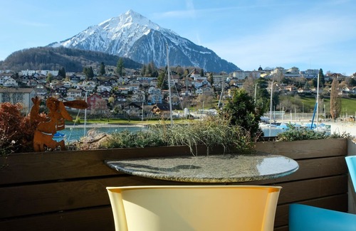 40 m2. More information by the provider: Situated in the heart of the most beautiful bay in Europe, the 2.5-room flat enchants with its breathtaking view of Lake Thun and the local mountain Niesen. Bedroom (double bed), kitchen-living room, bathroom (shower/WC) and balcony. Spiez Castle, cultural landmark of the region, towers behind the bedroom. The balcony and the nearby outdoor swimming pool (during summer) invite you to sunbathe.