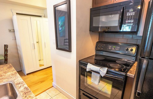 As you enter the unit, you’ll find a closet to the right for storing your gear, and a full bathroom to the left featuring a tub/shower combo, fluffy towels, a hair dryer, and locally made hand soap and shampoo.