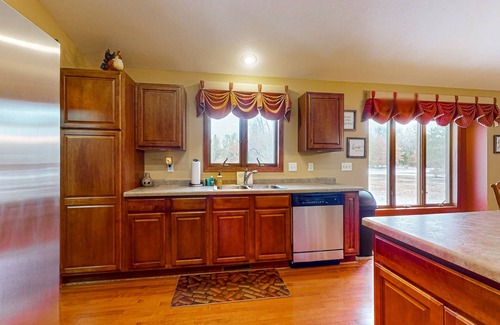 Inside this single-level home, you'll find a well-equipped, full kitchen with a breakfast bar, a dining area with a table for six - perfect for meals or game nights - and a warm and inviting living area with comfortable furniture, a flatscreen TV for streaming your favorite shows and movies, and a gas fireplace for those chilly fall and winter nights. Outside, the fun really begins with a furnished deck, patio, and gazebo along with a gas grill for summertime cookouts, two firepits, and an absolutely enormous backyard where the kids can run and play to their heart's content! Provided yard games include a horseshoe pit and cornhole (bean bag toss).