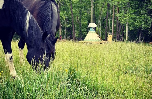 Stay in a Sioux design authentic Tipi. Our Tipi is secluded down by a beautiful creek. Surrounded by 21.5 acres of woods and pasture. Enjoy the quite mornings watching the horses graze in the pastures and gaze at the deer and lightning bugs in the evenings. It doesn’t get any better than this. Other things to note; you will have all the luxuries of home with many extras! We provide fresh eggs, homemade muffins, butter, and pound cake. Handmade soaps, bottle of wine and a s’mores starter kit! Our firewood is free! Oh and we also leave some extra snacks and items just in case you forget something. Come get lost at Lost Indian Camp.