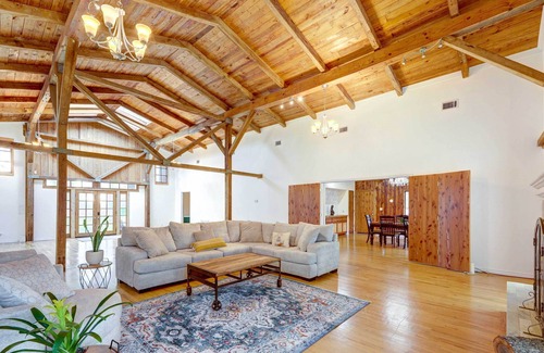 Get away from it all while still being within driving distance of the city at this vacation rental in Smithville, TX. This beautiful 3-bedroom, 3-bathroom home sits on 25 private acres enclosed by lovely foliage showing exactly how it earned its name of ‘Golden Pine.’ The spacious and minimalistic interior is accented by high ceilings and exposed wood beams made from the property’s trees. Head to Bastrop to sample local fare, take a day trip into Austin, or relax at home on the wraparound deck.