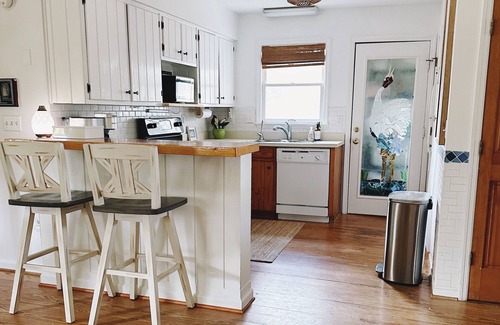 All three bedrooms are equipped with TVs for guest convenience. Primary guests will enjoy a private en suite featuring a soaking tub and standalone shower. The second guest bedroom includes private access to an open-air deck. Great for younger guests, the upstairs bedroom features a playful coastal theme and a custom barn-style sliding door. Central air-conditioning, free WiFi, and a private washer and dryer round out the in-home essentials.