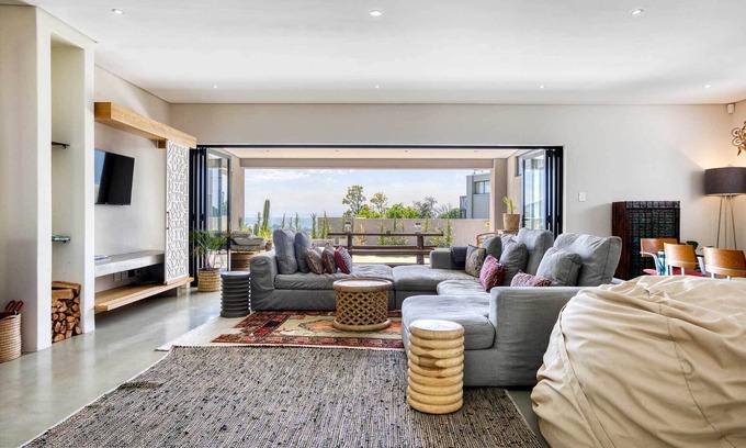 Multi-slide doors create a seamless transition to the outdoors and views of the Table Mountain cliff-face.