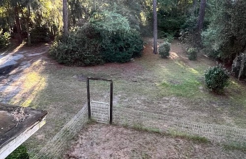 Providence Gardens completely surrounds the home with azaleas, 57 varieties of camelias, and wisteria. Huge pine trees, magnolia trees as well as the majestic Oak trees keep the property almost hidden from the world outside. The property owners have always had a barrier of foliage along the property lines, we have tried to respect the boundaries but had to do some major trimming to get control of the over growth. There once was a green house on the grounds and unfortunately a recent hurricane damaged it beyond repair. Unfortunately , there are remains of it pushed up at the back of the property line awaiting removal. Please pardon the messy progress..