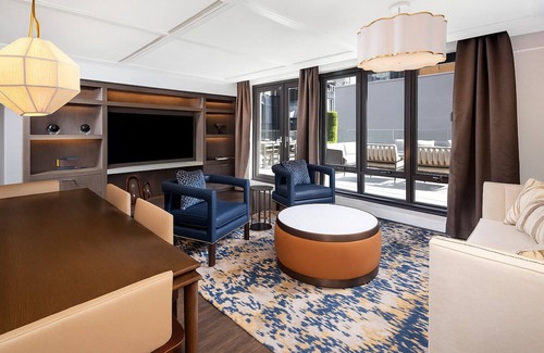 Two blocks from Central Park and steps from Carnegie Hall, this one bedroom deluxe penthouse suite located on the 18th floor of Hilton Club The Quin New York, West 58th St. and 6th Ave (914 sq ft). Offers a king bed and a bathroom equipped with a shower, soaking tub, bidet toilet and separate powder room. The separate living area features a queen sofa bed, 65-inch TV, dining table for 6, and a spacious balcony. The fully equipped kitchen includes a 2-burner stovetop, oven, small refrigerator, dishwasher, microwave, and espresso coffeemaker. Sleeps (4). Includes access to onsite fitness center as well.