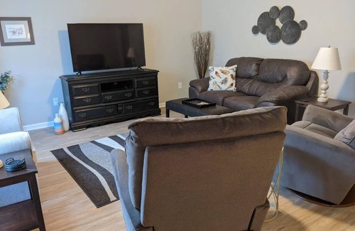 This 2-bedroom, 2-bath condo is in a quiet community about 2 miles from I-75. Your stay here includes use of the garage so you can keep your car out of the hot Georgia sun. There are no neighbors behind making for a pleasant back patio to relax. This is an end unit, so only one attached neighbor. In addition to a comfy living room with large 55" television, there is also a small family room off the kitchen in the back. The large eat-in kitchen is well equipped. The master bedroom has a king size bed. The guest room has a queen bed to sleep 2 more.