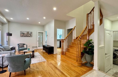 This stylish place to stay is perfect for group trips. Experience ultimate comfort in this 4-bed, 4-bath Mississauga home. Relax on the ground level’s inviting living and dining areas, then cook in a fully equipped kitchen. Upstairs, unwind in your primary suite with walk-in closet and spa-style ensuite. The rec-room basement boasts a sauna for pure indulgence. In-unit laundry and powder room complete the convenience. Book now for your next getaway! Next to Erin Mills Town Center and Highways.