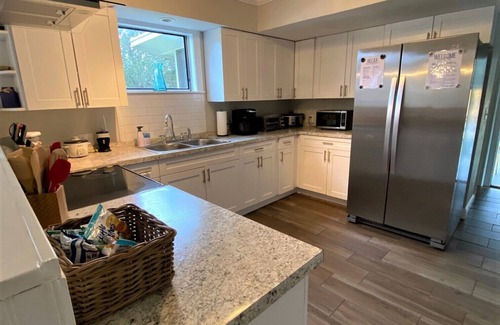 Newly remodeled and fully fenced, family and dog friendly bungalow in Wesley Chapel on 1/2 acre. Open-plan layout with 3 bedrooms and modern amenities. Features a spacious screened porch with a ping pong table, hot tub, backyard hockey net, basketball hoop and putting green. Outdoor BBQ grill area, picnic table and front porch chairs. Ideal for a relaxing get away with family and friends.