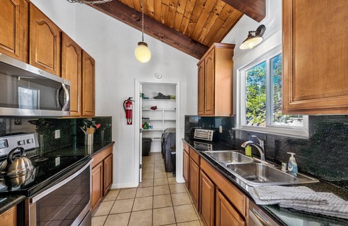 The upstairs features an open floor plan with a fully equipped kitchen including dishwasher, gas stove, coffee maker, microwave, granite counter tops and all the necessary kitchen ware to cook a family meal. The main living room upstairs includes a 40 inch flat screen TV, Sound System, Wifi and Apple TV with Netflix. This area is heated by it's own natural gas fireplace located in the center of the room. The spacious upstairs bedroom has a queen bed with a large closet and skylight.
