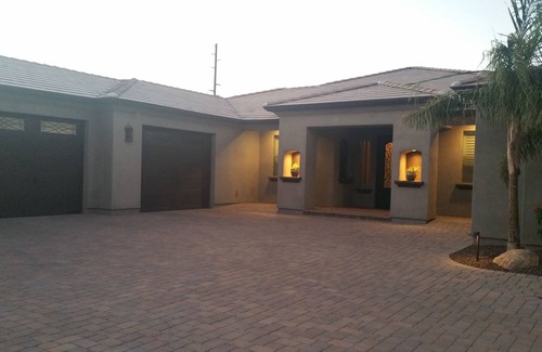 This upscale newly built home is located in a private neighborhood of North Phoenix. Surrounded by the rugged desert mountains, there is easy access to nearby hiking and biking trails. Guests are sure to enjoy a memorable vacation in this fully furnished, four bedroom/four and a half bath home.The main/master bedroom is equipped with a king sized bed, there is a mini master with a queen bed,its own bathroom,t.v and walk in shower.while the two remaining rooms are furnished with a king bed and a queen sized bed, comfortable for sleeping 8 people. There is also an additional living space furnished with a queen size sleeper and room to sleep up to two people. The kitchen is perfect for dining as it is equipped with state of the art appliances, complete with dishes and utensils, and seating for ten. There is a comfortable open floor plan with room to spread out. Four large screen televisions with Direct TV are located in the living room and master bedroom,family room and back porch. Situated near I-17, there is quick access to Happy Valley and North Phoenix. Head 20 minutes east on Cafefree highway to reach Scottsdale, or you can head west on Carefree highway to Lake Pleasant. Guests can enjoy an afternoon of golf, shopping and many great restaurants located nearby. Relax and enjoy the beautiful sunsets from the privacy of the resort style backyard with a solor heated pool and hot tub.Lots of outdoor seating and a fireplace for your evening enjoyment.Built in barbeque and bar area also.The pool does not have a fence around it, may not be suitable for small children.