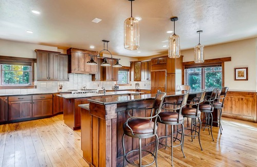 A large gourmet kitchen will inspire the cooks in your group with professional appliances, two large islands with bar seating an oversized refrigerator, and a freezer. The kitchen opens to two dining areas, side by side, with seating for up to 16. After dinner, cozy up in the adjacent fireside nook, a unique and cozy space to spend time with family and recap the day's adventures.
