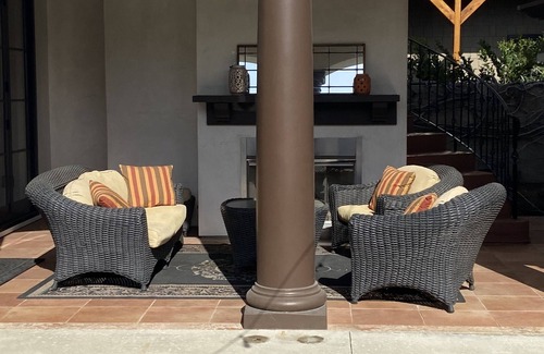 INDOOR OUTDOOR cascading doors to allow access to covered living space with fireplace