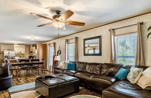 Enjoy a private beach, 2-story tree house bar, picnic area, fire pit, screened gazebo with fuse ball, full 4 bedroom ranch manf home, tiny house with game center plus 1 acre activity center with disc golf, horseshoes and more. Your stay can even include kayaks and paddle boards as you launch from your private pier.