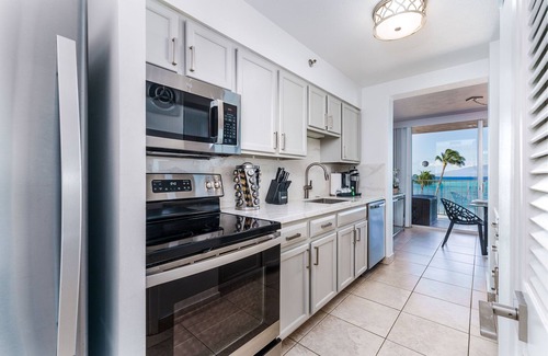 New designer furnishings. The kitchen is fully equipped and ready for you to cook a gourmet meal and enjoy on your private wrap around lanai. There are comfortable king beds in both bedrooms. A washer and dryer is included in the unit along with free Wi-Fi, flat screen smart TVs in each room, dining room for 6, sofa bed in living room and 2.5 bathrooms. AC Newly redone pool and BBQ area, shuffleboard, ping pong, gym and parking. Near all popular attractions. Walk to restaurants, shops and of course the beach.