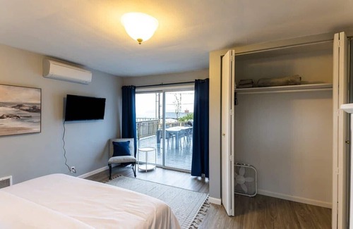 The Main Level Master bedroom features a Comfortable King bed with high quality linens and pillows. There is closet space and a dresser for guests personal items. This bedroom also has a ROKU TV for guests enjoyment. Large windows and a sliding glass door to the deck bring in sunshine and privacy curtains can be drawn for privacy. Views of the bay and a comfortable chair for sitting make this room the perfect place to enjoy a book or some quiet time taking in the beauty.