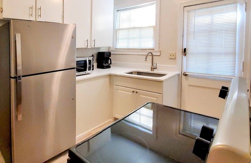 This quaint and historic 1st floor apartment is bright and spacious. As you enter the home you will be welcomed by the comfortable living room with a sofa that also pulls out into a queen sized sofa bed. The living room has its own privacy door making it a convenient 2nd bedroom. Enjoy being centrally located and just steps to The Shoppes of Avondale with amazing restaurants and shops and just across the street from a park with a playground for all ages and a paved nature trail.