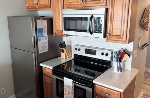 The kitchen is fully stocked with everything you would need for your stay. We have added a Keurig coffee pot for those of you who have their favorite pods to bring as well a large capacity brew pot. Both TV's are equipped with Amazon fire stick. Netflix is included along with YouTube TV app and highspeed internet. The beach and pool couldn't be any closer. The oceanfront pool provides lounge chairs for your comfort and a shower to rinse all the sand away. There is also a picnic area for grilling your fresh caught fish. You are only a short walk from restaurants, shops, beach rentals, fishing pier, arcade, museum and putt putt golf. The unit offers a stacked washer and dryer for your convenience as well. There is plenty of parking for your car and a parking tag to hang from your mirror will be in the unit for you. A storage space on the ground will be available for you to store your beach/pool items. You are welcome to use and return the items that are in the storage area.