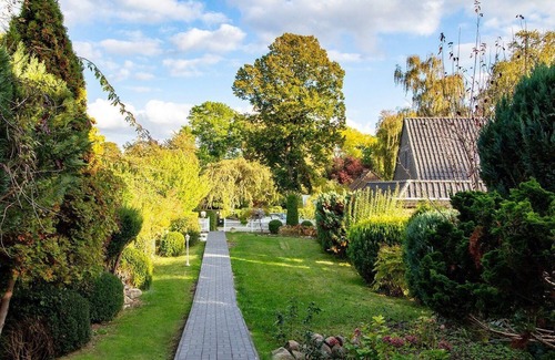 The Strandhaus Seestern, nestled in Hohwacht's charming Waldstraße, accommodates up to 10 guests with lush gardens, spacious rooms, a cozy fireplace, and proximity to the beach and local delights.