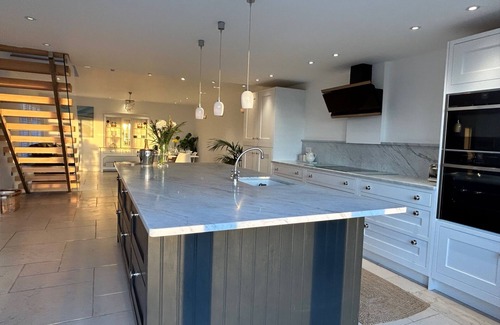This large open plan property is a luxurious throughout with an extremely large open plan luxury kitchen with marble topped island, overlooking the sea; bedrooms all with en-suite designer bathrooms, a tasteful interior giving a feel of a New England beach house. White and cream throughout, it exudes an air of calm and tranquility that enhances the stunning views from all of the rooms. With plantation shutters, cream limestone floor, marble topped kitchen island and worktops, underfloor heating and intelligent lighting system - it has a contemporary feel. The log burning stove provides a cozy retreat when the weather changes over the sea. It has 3 double bedrooms (one extremely large Master bedroom) all ensuite with the highest quality bathrooms. It also has an additional bathroom on the ground floor. A flat screen television and internet access are provided. The modern fitted kitchen is fully equipped and laundry facilities are also available. At the rear of the property there is a charming courtyard and gated entrance providing complete privacy. Off road parking (including a garage with an electric up and over door) is available for up to three cars. One in the garage, 1 or 2 in the courtyard.