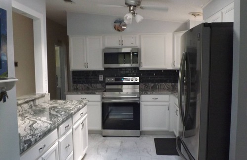 This home has 1,300+ square footage plus the porches. It has a 65' TV in the living room, new living room couch and love seat with four recliners. There is a view of the golf course from the living room too! The kitchen is brand new as of August 2021. There are all new appliances, new soft close cabinets, and granite counter tops. It has a master bedroom with a view of the course, a king size bed, two dressers, desk and a 55" TV. There is a walk in closet and an attached master bath with a walk in shower. The guest bedroom has a queen sized bed, and a dresser. The guest bathroom has a tub and shower combo. The washer and dryer are new and large capacity. They are located in a room off the porch so you do not have to walk outside to do clothes. There is also a view of the golf course from here! There is a large refrigerator in the 14X14 laundry room which is for extra food or beverages. A golf cart garage is attached to the laundry room so you can keep dry if it should rain.