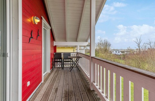 This fantastic two-storey holiday home in the holiday home village of Süssauer Strand is located directly on the Baltic Sea. You can enjoy the sun and the beautiful Baltic Sea air twice: from the cosy living area you can access the pretty veranda surrounded by greenery. On the first floor, you have direct access to the balcony from two of the three bedrooms and can let your gaze wander over the meadows to the Baltic Sea as soon as you get up.
