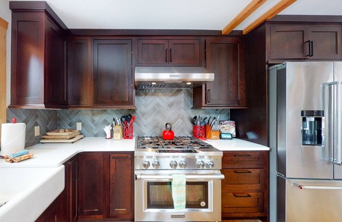 The main floor features soaring ceilings with knotty-pine detailing and exposed beams, hardwood floors, and enormous windows that flood the space with natural light. The stylish, well-equipped kitchen features a full suite of stainless steel appliances, including a six-burner gas range. At mealtime, there’s room for the whole gang at the spacious dining table. Finally, you’ll find another living room and a full kitchen downstairs, so the kids won’t have to come upstairs for snacks when they take over the TV.
