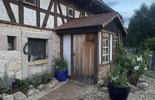 You can look forward to a delightful 4-room farmhouse spanning 200 square meters across two levels, offering rustic and cozy furnishings. The open living and dining area features a sofabed, satellite TV, and a tiled stove, with access to the garden and terrace. The kitchenette is equipped with a dishwasher, two ceramic glass hob hotplates, a freezer, and a grill, complemented by a dining table and nook. There is also a hip bath and WC on the main floor. The upper floor, accessible via an open staircase, has a playroom with one bed and another room with one bed. The top floor boasts a room with sloping ceilings and two beds.