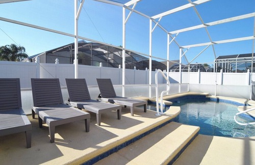 After a long day riding the roller coasters, you will love heading home to your private full-sized, west-facing pool! The screened-in pool deck has a shaded dining area and four sun loungers. The pool can be heated (pre-bookable optional extra) and a pool security fence is provided for families with small children.