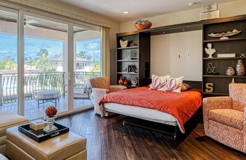 We have 2 bedrooms upstairs. The 1st guest bedroom has a queen-sized bed and an ensuite bathroom. The other guest bedroom has a king-sized bed and an ensuite bathroom. There is also a generous loft (4th bedroom) with a queen Murphy bed and a covered balcony overlooking the water.