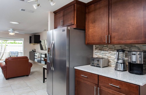 Renovated, nicely appointed 2 bedroom (with 2 king beds), 1 bathroom ground floor unit with your very own expansive, enclosed, private deck with Tommy Bahama beverage center/cooler/bar and outdoor dining … everything you need for entertaining outdoors 'Florida style'… including your very own palm trees!