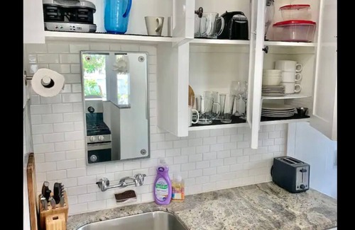 Sophisticated, stylish Beach-side suite, 50in smart tv, twin size mattress in hallway closet, granite countertops, toaster, coffee maker, French press, microwave, blender and cooking basics and essentials, towels, sheets, queen size canopy style bed frame, hallway closet and vanity closet areas. Tub and shower. Two diners and a mini market one block away. Beach 1 min walk. Take $40 off your 1st trip. NOT LOCATED ON Catalina Island!!