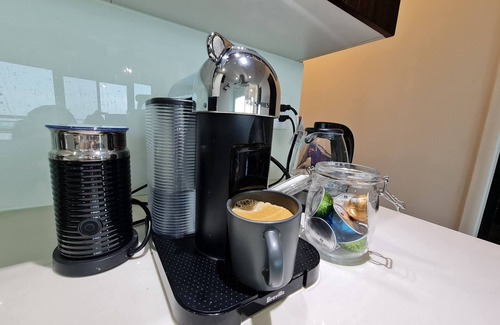 Large open-concept kitchen and living space with fully equipped kitchen, high speed WiFi, smart TV and a private balcony. Enjoy your daily dose of caffeine with breathtaking views and access to Nespresso, french press and a collection of teas.