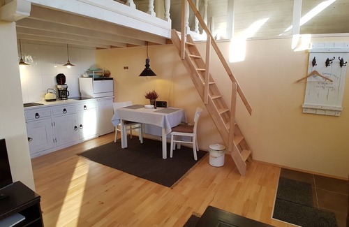 Our small, exclusive guesthouse with private entrance is open plan with living room, integrated kitchen and bathroom on the ground floor, plus a sleeping gallery on the first floor.