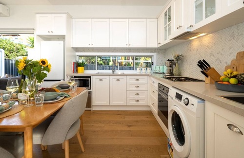 There are sliding doors on either side of the living room to provide air flow, along with ceiling fans in the bedrooms. The dining table seats 4 with another 4 seats. The kitchen is well laid out, housing modern appliances, equipment and plenty of crockery, glassware and platters. Coffee lovers, you’re in for a treat. Sunshine Cottage has a moka pot, plunger and Sunbeam espresso machine giving you the option of picking the exact coffee to suit your mood, be it your morning cup or the evening espresso martini.