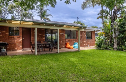 The large backyard is a haven for families, offering ample space to play, relax, and enjoy the outdoors. A large tree provides shade and serenity, creating a peaceful atmosphere for both adults and children to appreciate. Whether you're gathering for a barbecue, playing games, or simply basking in the coastal breeze, the backyard at "Surfway - Berrara" is a delightful extension of your holiday home.