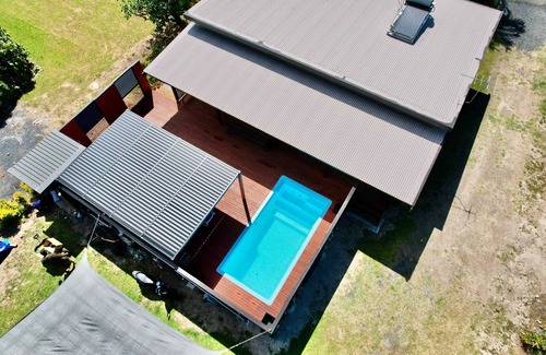 The home has a lounge covered veranda that extends to the pool. Going into the lounge, the owners eye for detail will become apparent when you get comfy on the sofa and feel the breeze come in from the outside , Both bedrooms flank on either side of the living room, both have ensuites and also sliding doors back out to the veranda. Both bedrooms have queen beds. At the back of the lounge is a fully kitted out kitchen, with the usual bits and pieces but also a very big water cooler which will be super welcome on hot days (about 365 a year). All the rooms have ceiling fans and have mozzie screens.
