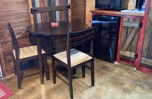 The Take a Hike Cabin offers a king size bed and a walk in tiled shower with Handicap rails. Barn wood, knotty pine, and corrugated tin are used throughout the spacious cabin. Dark stained concrete floors and tin ceilings really add a rustic yet elegant vibe. The kitchenette area has a mini fridge, microwave, k cup coffee maker, along with tables, and chairs. There is also a plus loveseat.