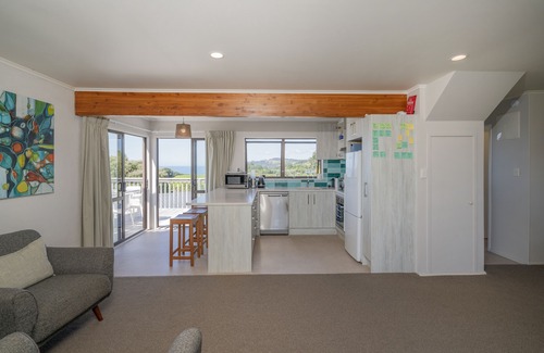 A two-bedroom, two-bathroom holiday home spread across two levels, Te Whare Whakatā sits up on the top of a hill at the end of a long cul de sac. It is the ultimate cosy family holiday home, made even more special by the spectacular sea views.
