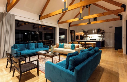 Te Whau Retreat is a contemporary architect designed home with exceptional comfort. Step into a grand open-plan living space where floor-to-ceiling glass frames the ever-changing coastal landscape. Wide oak floorboards, minimalist art, and bespoke furnishings evoke a quiet elegance throughout the home.