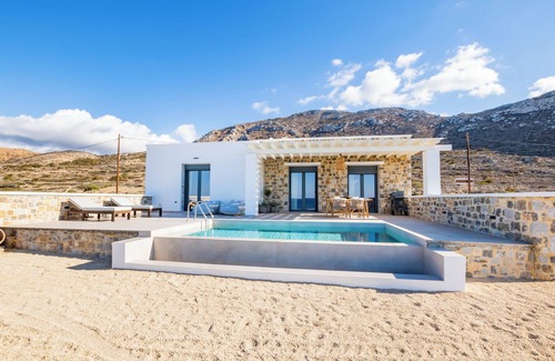 Terramare Villas is a fully equipped 75m² stone-built luxury residence, with a private pool, large patio area, a fully furnished bedroom, two bathrooms, and an open-plan living room and kitchen.