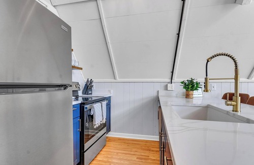 'The A-Frame' is newly remodeled and boasts a fresh new vibe. Cozy and private while situated in a commercial district, this home gives guests the best of both worlds. Located on one of Bristol's main entry routes from I-81, this home is easy to find and close to everything. Basically everything in this home is new. The kitchen has new cabinetry, quartz countertops, appliances, cookware and dishware. A separate coffee bar has a standard drip machine and a Keurig for coffee lovers. The two full bathrooms have a custom tile shower with bench seat, new tub/shower combo, new vanities and new lighting. Half bath has a new tile floor and vanity. All three bedrooms have new beds, pillows and accent furniture. All new linens throughout the house as well as a new washer and dryer. The property has been professionally landscaped and a privacy fence allows guests to enjoy the firepit area and outdoor grill. There is a Mediterranean restaurant next door and a coffee shop/bakery two doors down.