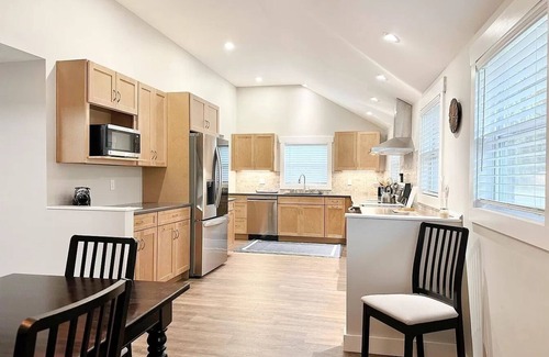 - Kitchen supplies: pots & pans, dinnerware, bakeware, plasticware for children, toaster, blender, dual coffee maker (drip), glassware, food storage containers, wine glasses, and more!
