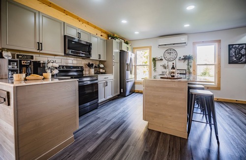 Inside, the first floor are mostly all pine wood, giving the farmhouse an incredible rustic ambiance in contrast to the brand new furniture, appliances and electronics. Newly installed Mr. Cool mini-splits for AC/Heating, keeps the farmhouse at just the perfect temperature for you and your crew.