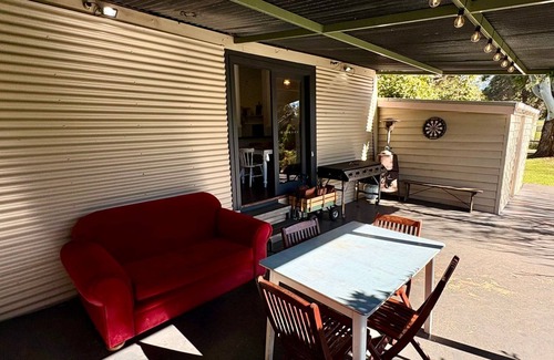 The home features one queen bedroom and a second bedroom with two single beds—perfect for couples or small families. The comfortable lounge includes a TV, and outside, you’ll find a peaceful patio area with outdoor furniture and a BBQ for relaxed evenings under the stars.