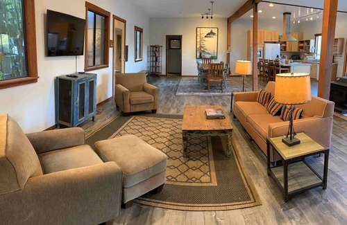 The remodeled lodge has a 500 square foot wrap-around deck and is perfect for a family vacationing together or for a group retreat, where both public and private spaces are important.