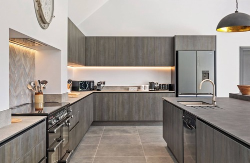 Kitchen area: Freeview Smart TV, Electric Oven, Induction Hob, Range, Microwave, Slow Cooker, American Fridge Freezer, Wine Cooler, Coffee Machine, Dishwasher, Bi-Fold Doors Leading To Patio